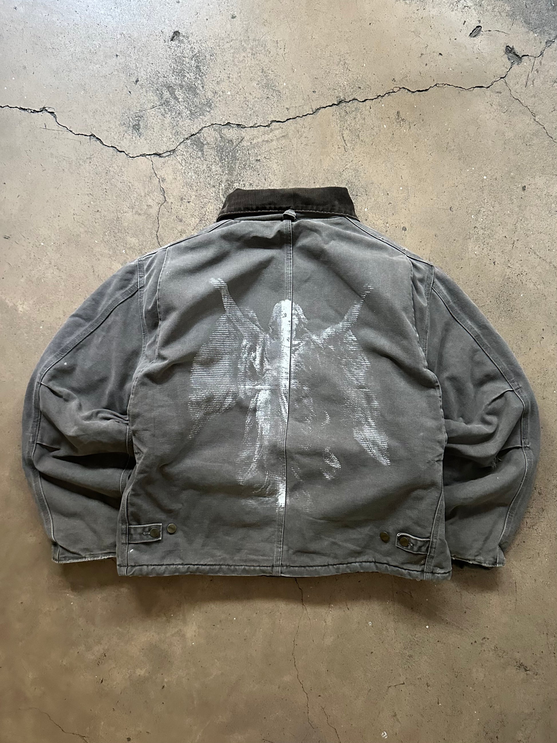 Clay-toned canvas meets angelic chaos — this vintage 00’s Carhartt Arctic jacket is fully custom, featuring front metal clasps and a surreal back print that turns heads. Heavyweight. One-of-a-kind. Pure statement.