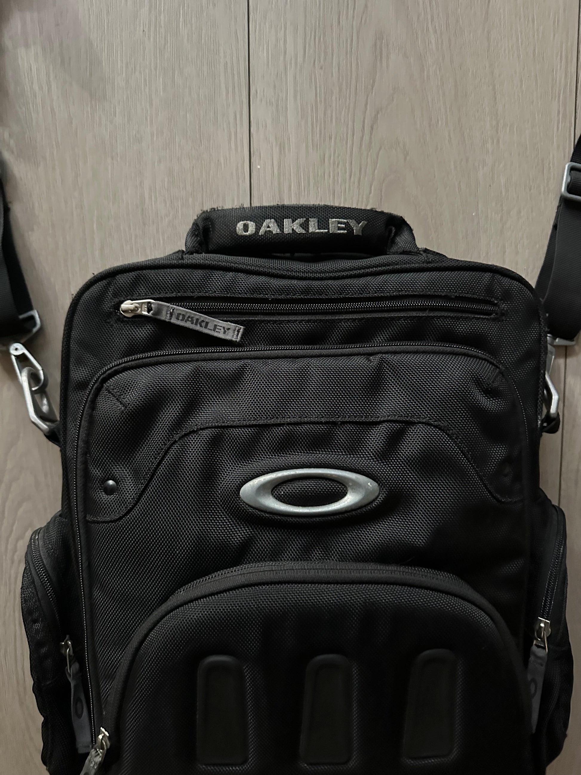 Heavy-duty build with metal Oakley logo and multiple compartments, including laptop storage. Functional crossbody design with durable tactical feel.