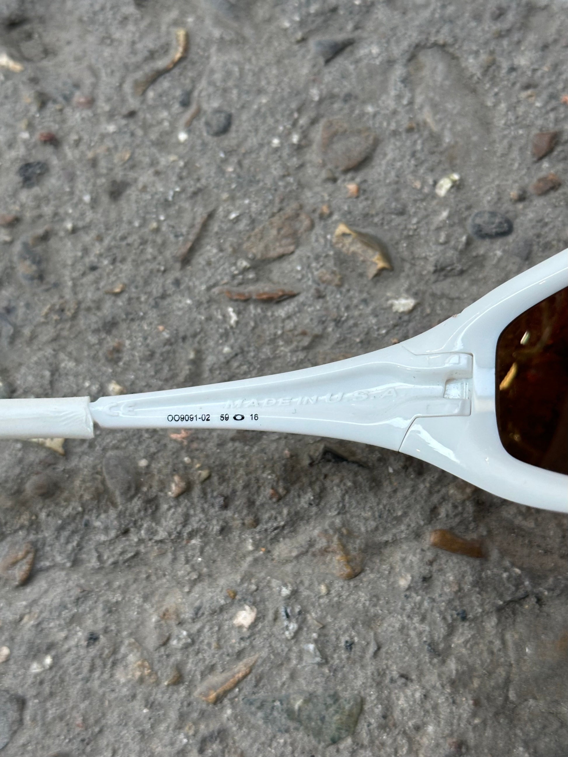 Set up for style and performance. This setup includes Oakley’s comfortable white-frame wraparound sunglasses with two sets of interchangeable lenses—clear (or neutral) plus a bold purple pair (it has small details of use, nothing very noticeable).