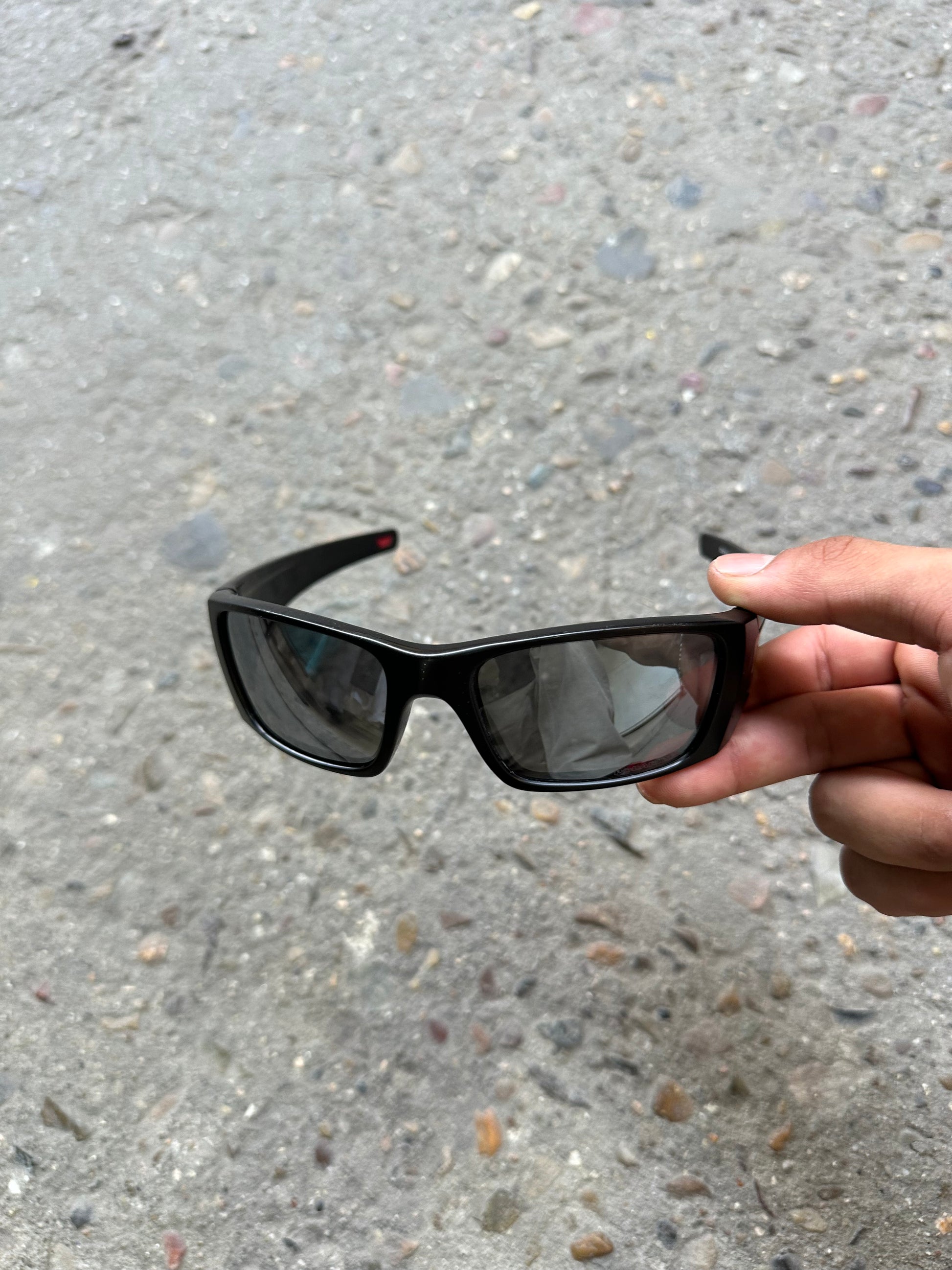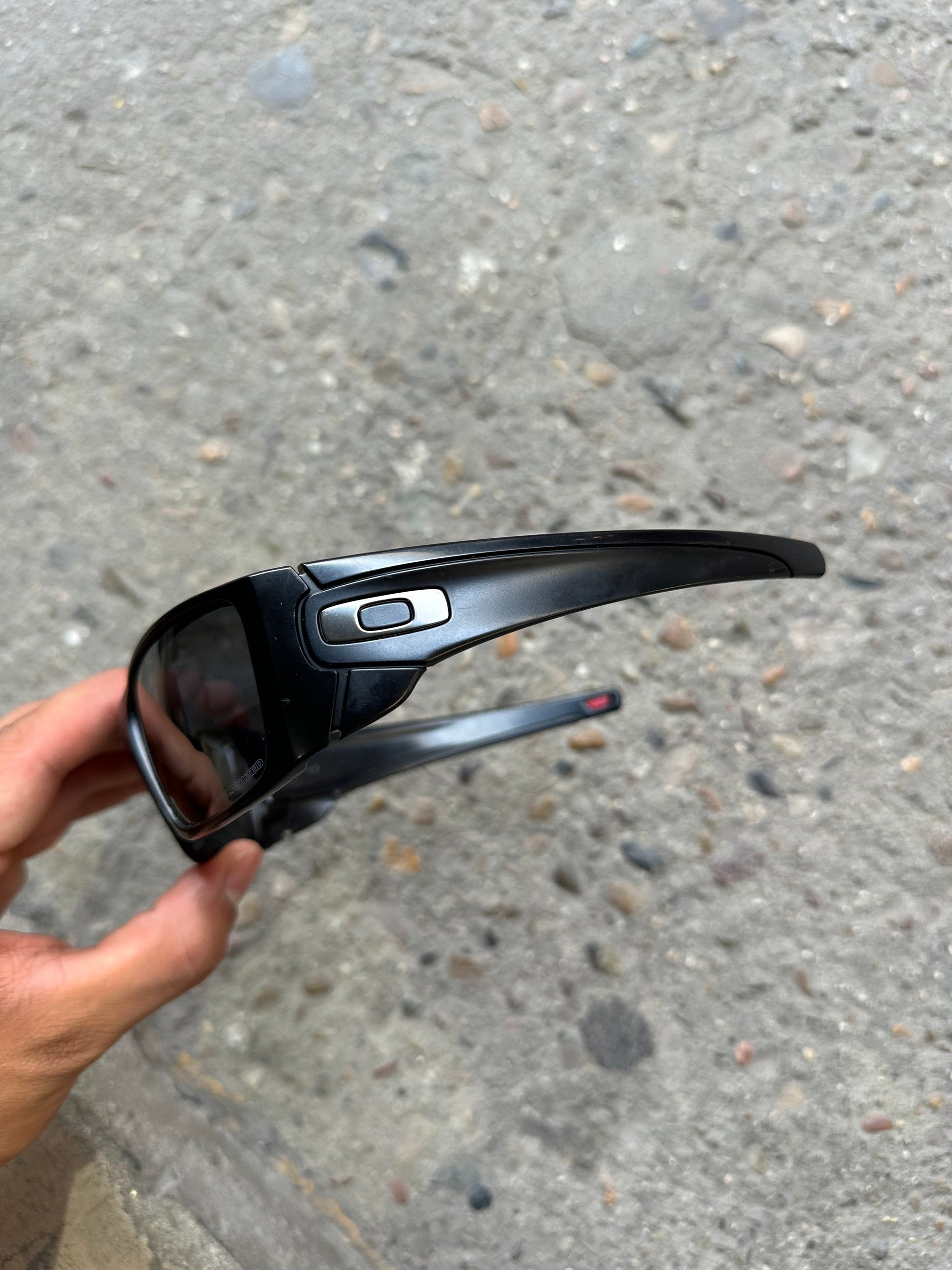 Chunky matte black frame with bold arms and clean wraparound fit. Features 100% polarized lenses in flawless condition. Includes Oakley hard case.