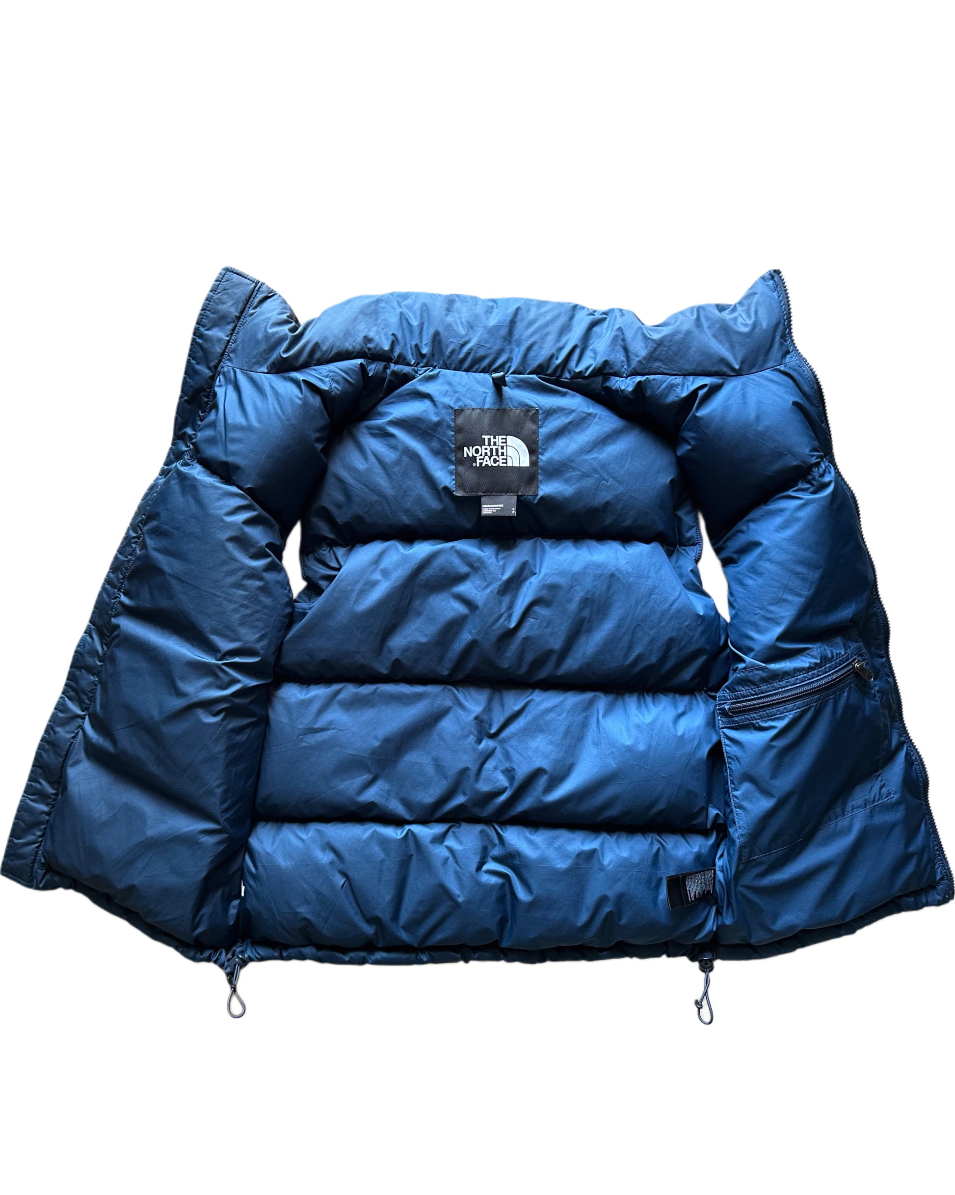 Navy blue goose-down vest with hidden hood tucked in the collar. Premium warmth, lightweight feel, and flawless condition — a TNF essential.