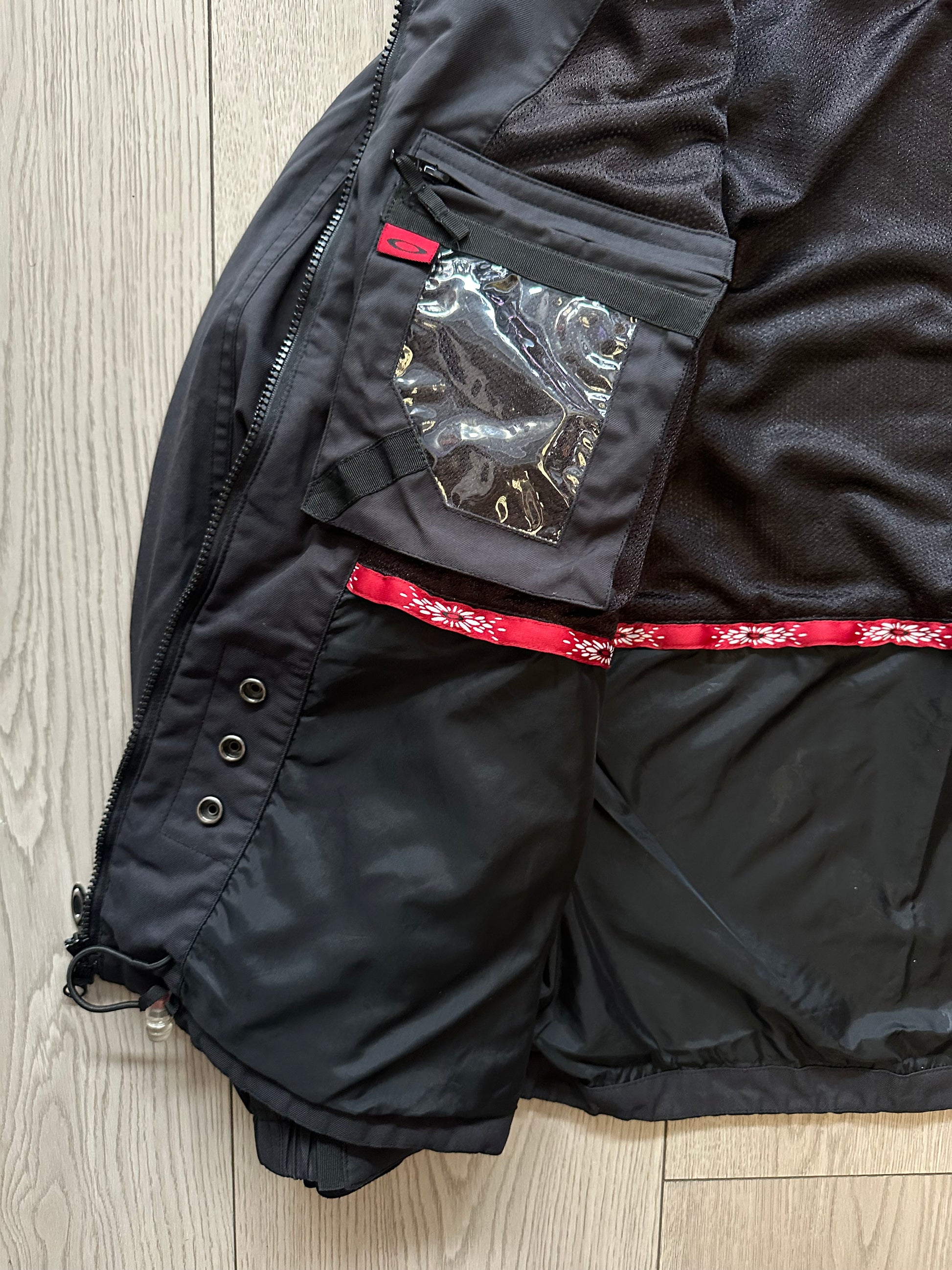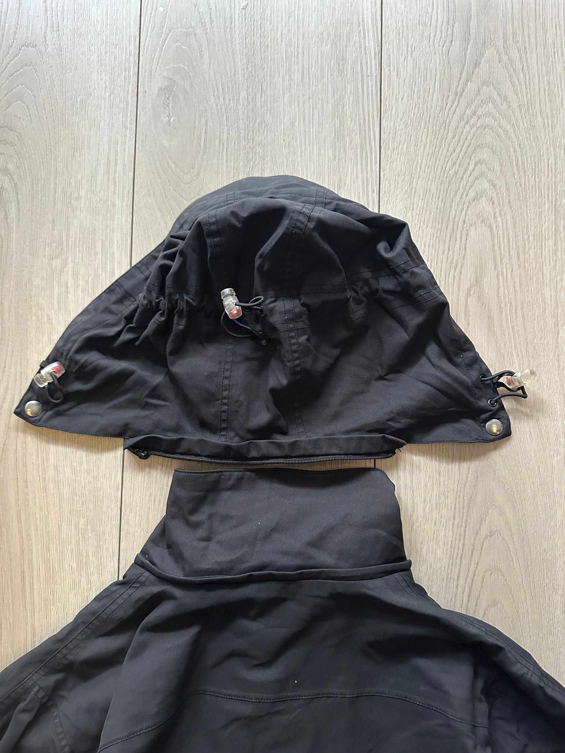 Rare Oakley archive piece loaded with 90s tech details: removable hood, inner sleeve “gloves,” transparent pocket panels, multiple zippers, and adjustable waist + hood toggles. Built with full tactical functionality.