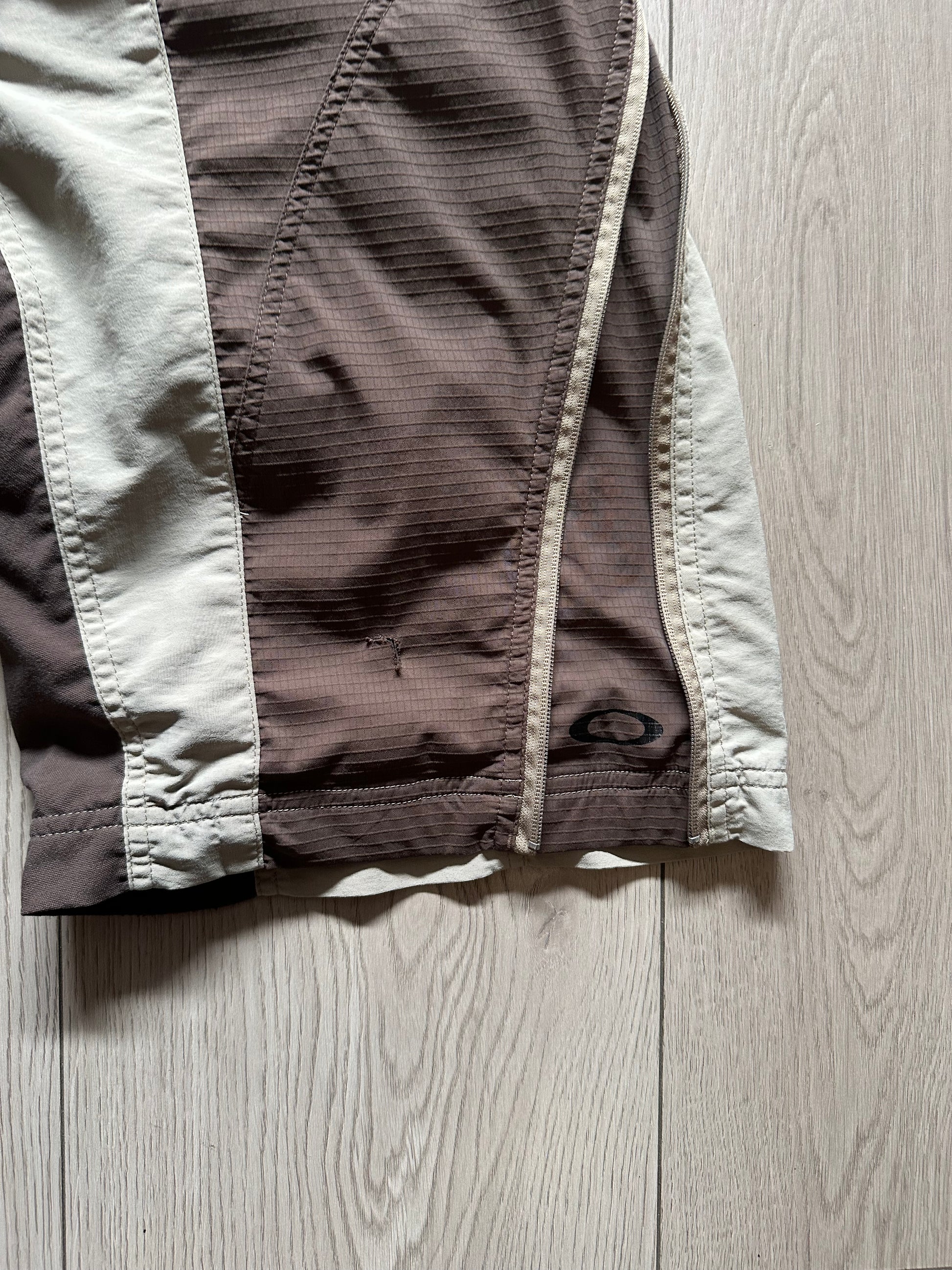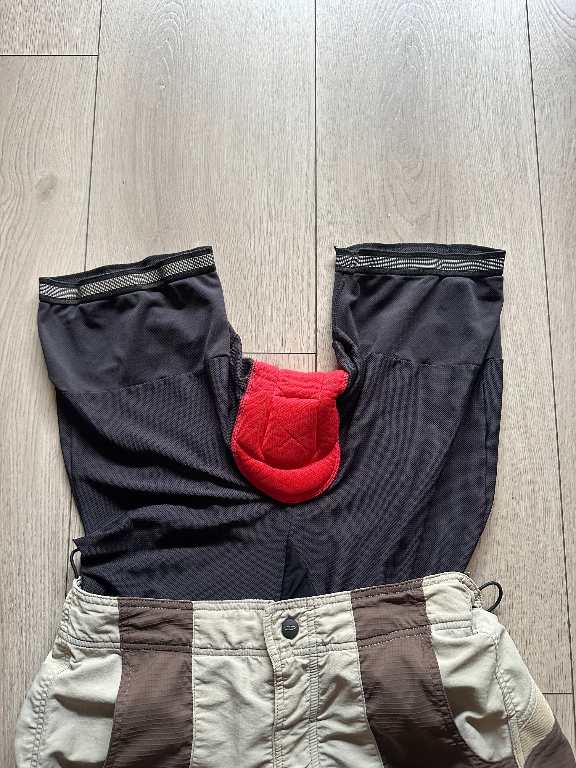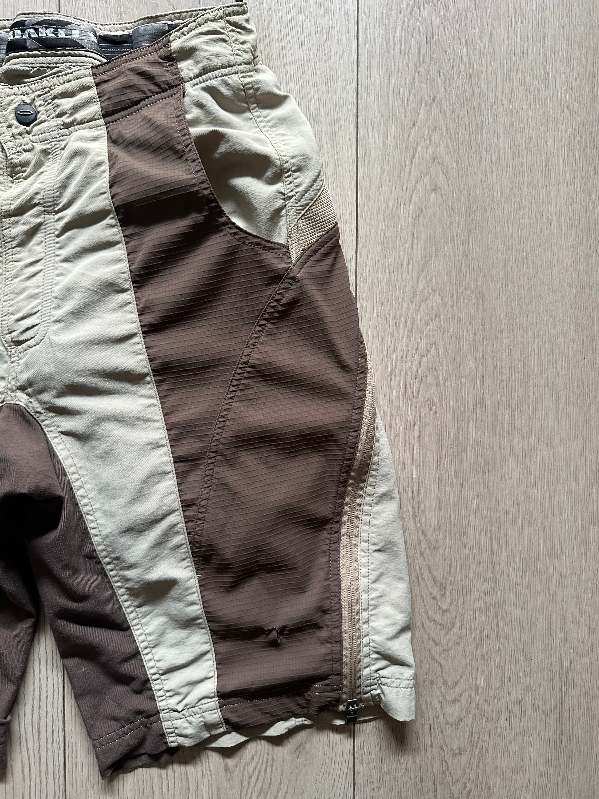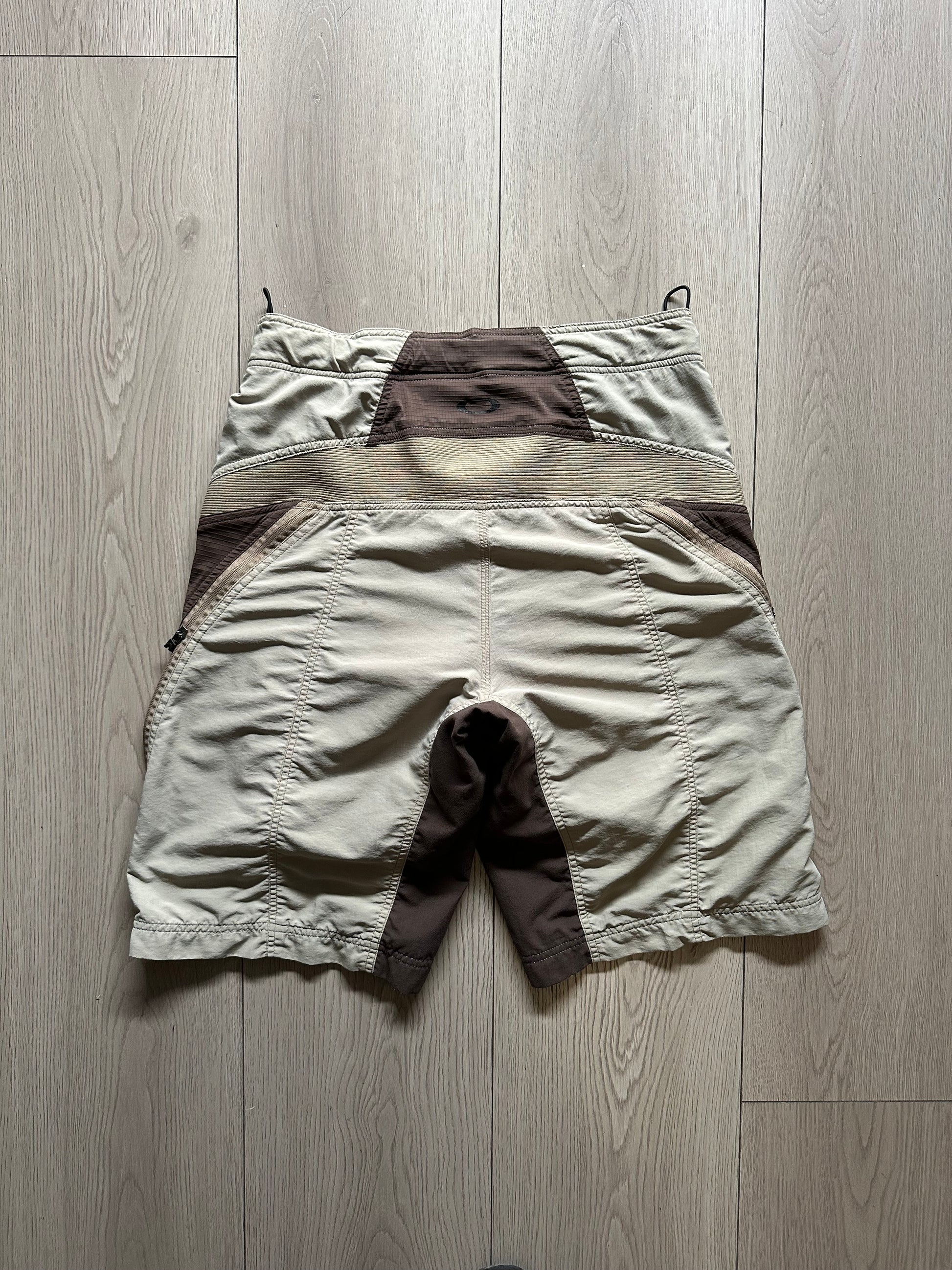 Vintage Oakley cycling shorts with brown & beige panel design. Features include ergonomic red chamois padding, zippered details, stretch waistband, and classic Oakley branding throughout.
